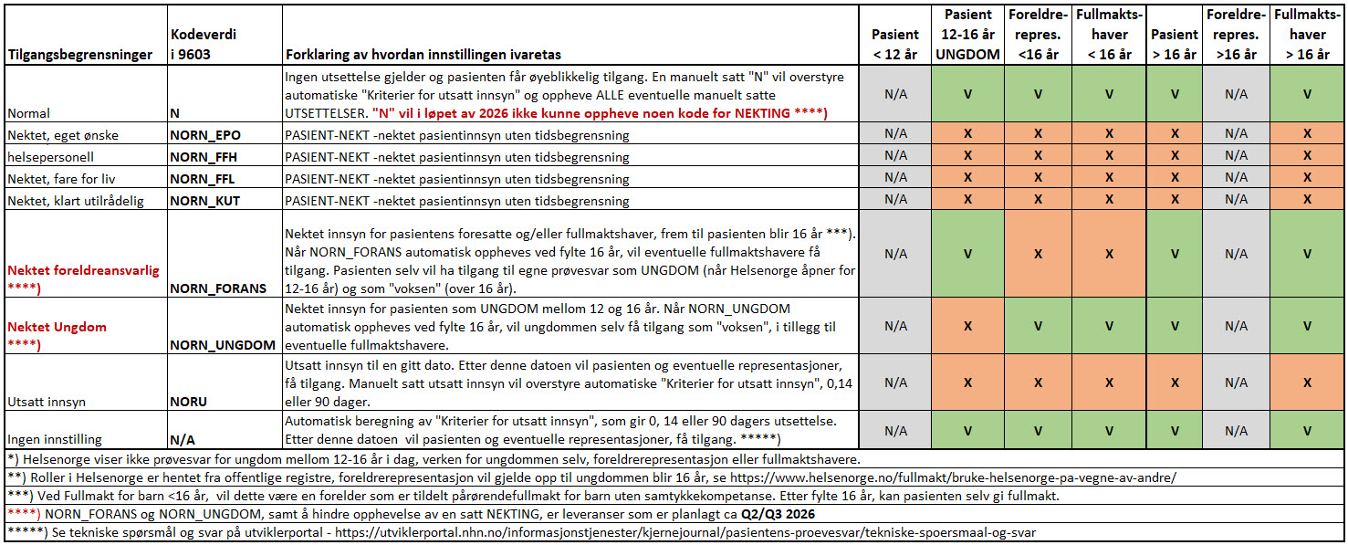 Nektet foreldreansvarlig | NORN_FORANS | Nektet innsyn for pasientens foresatte og/eller fullmaktshaver, frem til pasienten blir 16 år. Når NORN_FORANS automatisk oppheves ved fylte 16 år, vil eventuelle fullmaktshavere få tilgang. Pasienten selv vil ha tilgang til egne prøvesvar som UNGDOM (når Helsenorge åpner for 12-16 år) og som "voksen" (over 16 år). NORN_FORANS er forventet levert av NHN i løpet av Q2 2026 |